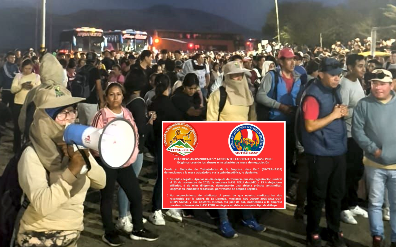 La Libertad, 12 de enero 2026.- Trabajadores de Hass Perú, empresa agroexportadora dedicada al cultivo de palta y arándanos en el departamento de La Libertad, han hecho pública una denuncia grave contra la compañía por presuntas prácticas antisindicales. El Sindicato de Trabajadores de Hass Perú (SINTRAHASSP), oficialmente registrado en diciembre de 2025 mediante la Resolución Subgerencial N° 000204-2025 del Gobierno Regional de La Libertad, acusa a la empresa de responder a su constitución con despidos de dirigentes y afiliados, hostigamiento laboral y deficiencias en medidas de seguridad que habrían provocado accidentes graves, incluyendo uno donde un trabajador perdió tres dedos de la mano.