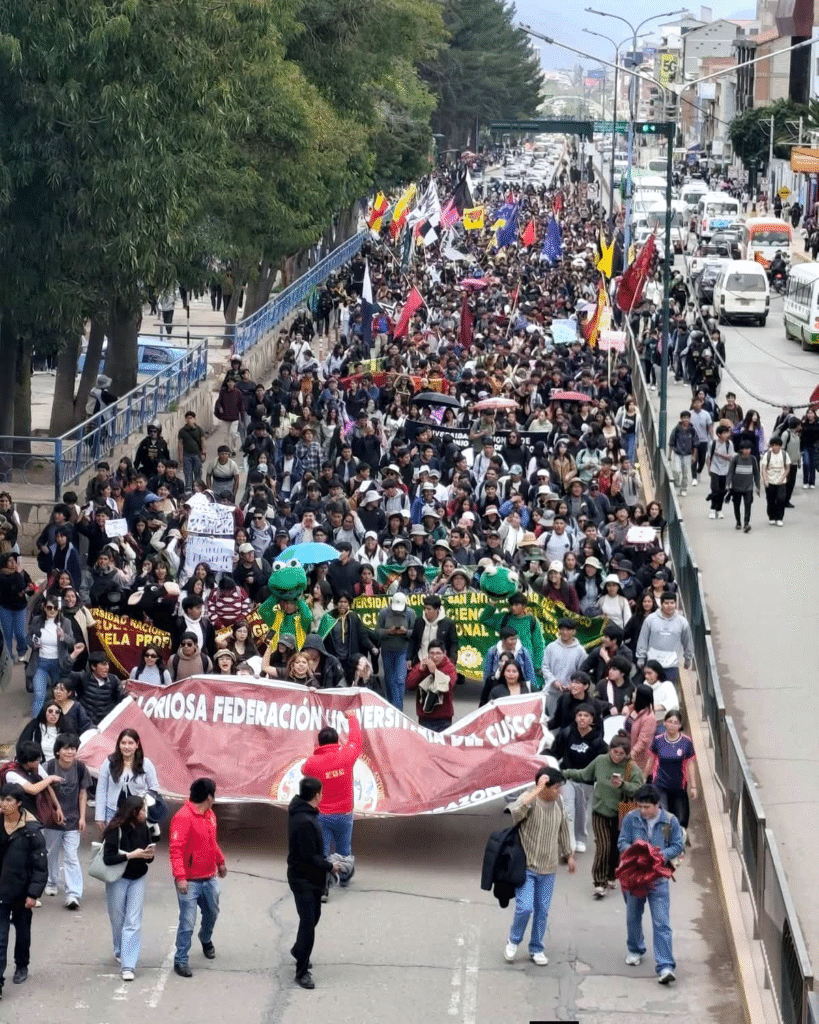La movilización, convocada por federaciones estudiantiles y colectivos universitarios, congregó a jóvenes de instituciones públicas y privadas. En el centro histórico de Cusco, los manifestantes recorrieron avenidas principales portando pancartas y entonando consignas en rechazo a lo que califican como un “aumento injustificado”.